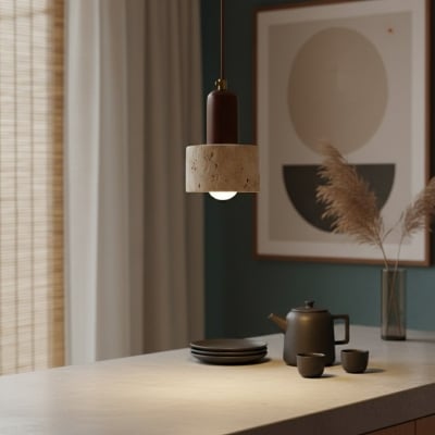 WabiLum Minimalist Japanese Travertine Wood Pendant Light - Elegant Home Lighting for Bedroom